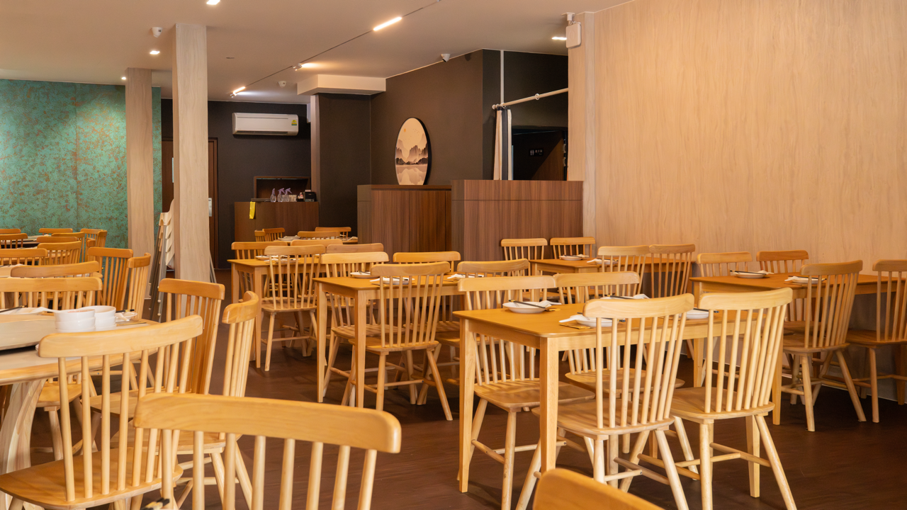 Our new dining hall houses 10 tables comfortably, with a choice of round and rectangular seating, accommodating up to 60 guests. Designed with modern touches of marble and wood, the space carries a gentle ocean-inspired theme — elegant yet inviting.